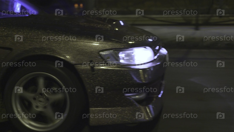 Боковой вид автомобиля, едущего вдоль дороги, фары освещают темную дорогу ночью