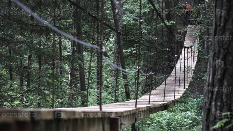 Сзади мужчина, стоящий на висящем деревянном мосту в зеленом летнем лесу.Мужской путешественник гуляет по национальному парку