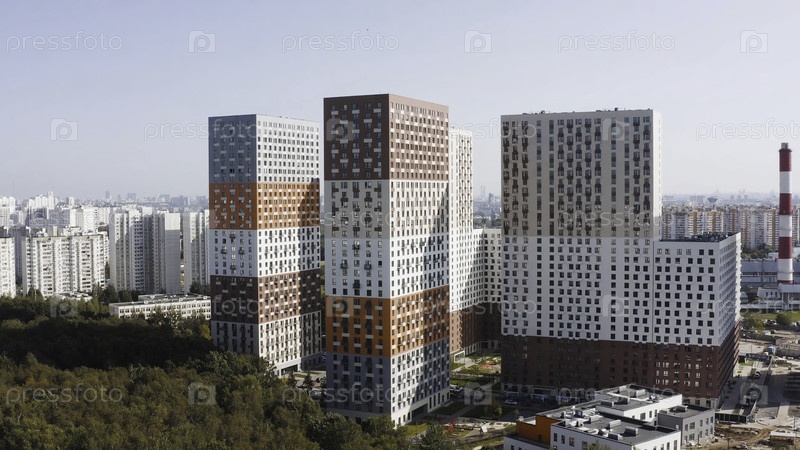 Вид на жилой комплекс с многоцветными высотными зданиями. Идите вперед. Красивый жилой комплекс с разноцветным фасадом рядом с зеленым парком на фоне города
