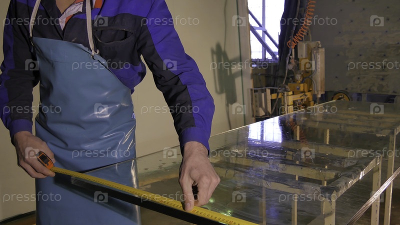 Работник очищает и сушит стекло на производстве. Улыбаясь, среднестатистический взрослый работник чистит мыло, засунутое в стеклянное окно со скипа. Сотрудники моют большое стекло окон на стойке. Используя воду, рабочий чистят стакан от пыли