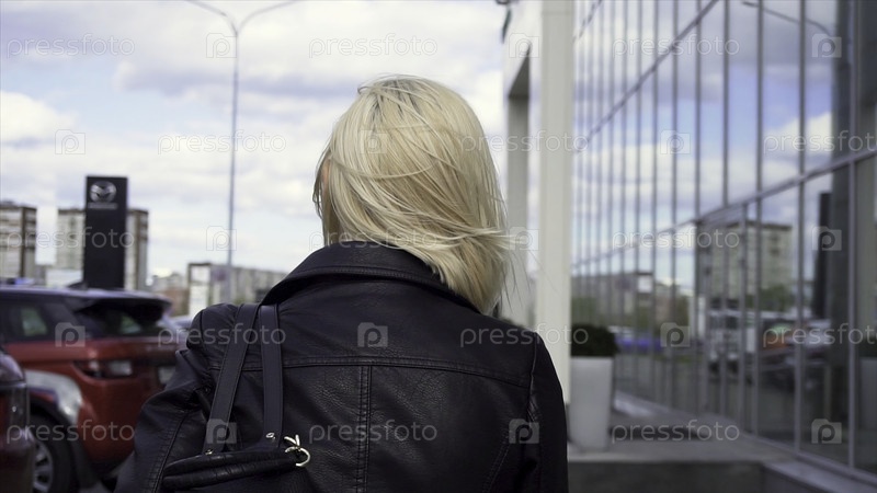 Сзади блондинка в черной кожаной куртке идет по городской улице.Молодая блондинка ходит по улицам с сумкой на плече