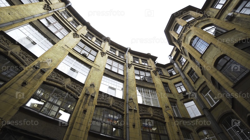 Нижний вид на внутренний двор хорош с красивой архитектурой старого дома. Идите дальше. Желтый жилой дом в готическом стиле в старом городе. Фантастическое старое жилищное здание в Старом городе