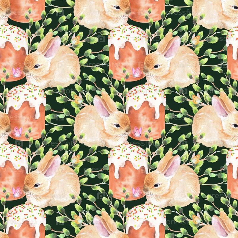 Бесшовный рисунок кролика, торта, ивы и бабочек на зеленом фоне. Иллюстрация акварели. Для ткани, обоев, упаковочной бумаги, поздравительных открыток, дизайна, декора и иллюстрации