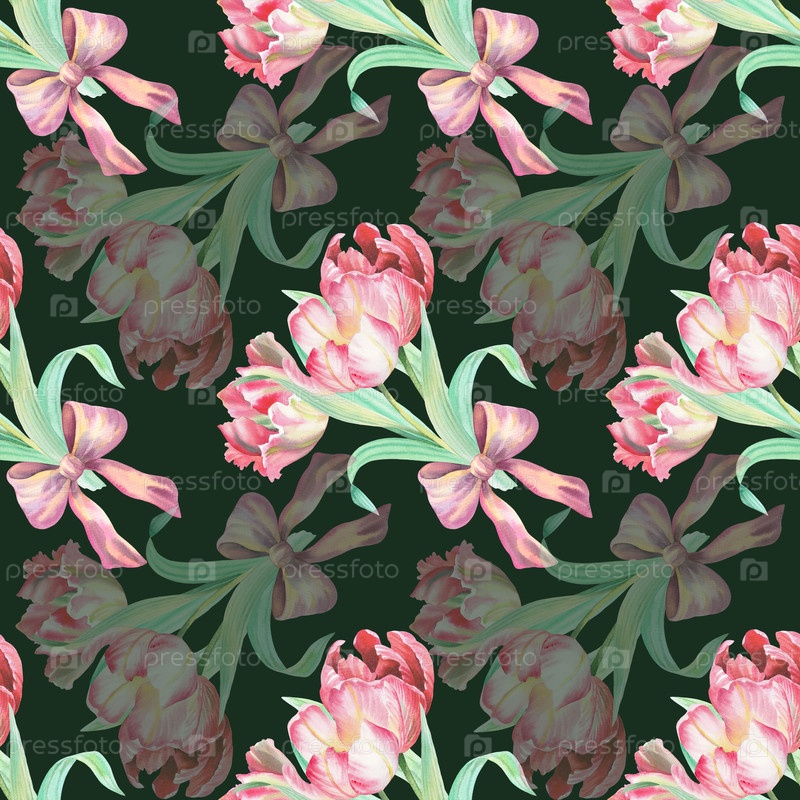 Бесшовный рисунок букета тюльпанов на зеленом фоне. Иллюстрация акварели. Для ткани, обоев, упаковочной бумаги, поздравительных открыток, дизайна, декора и иллюстрации