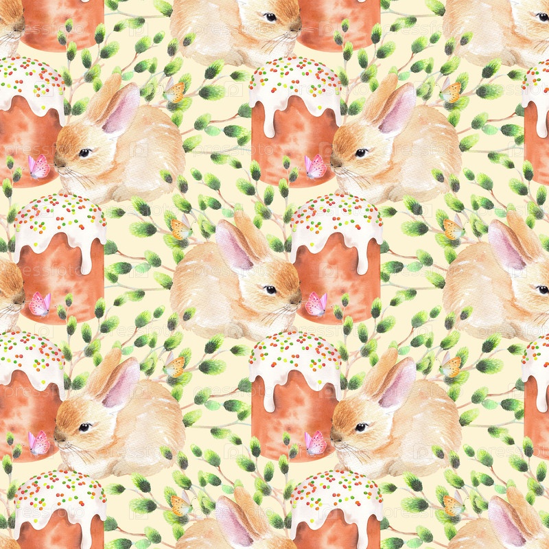 Бесшовный рисунок кролика, торта, ивы и бабочек на бежевом фоне. Иллюстрация акварели. Для ткани, обоев, упаковочной бумаги, поздравительных открыток, дизайна, декора и иллюстрации