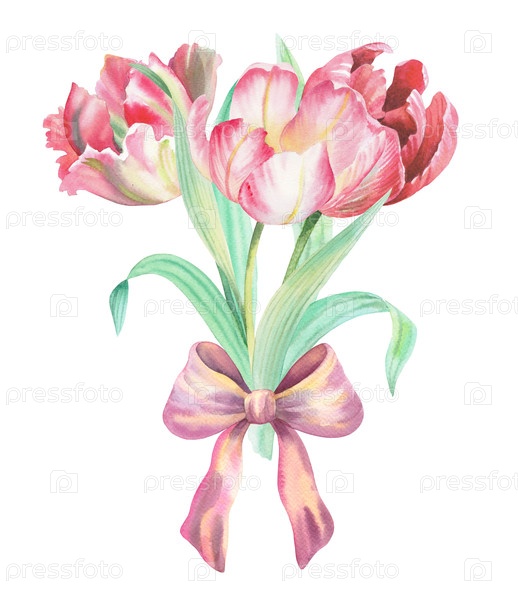 Букет тюльпанов и лука. Иллюстрация акварели. Для ткани, обоев, упаковочной бумаги, поздравительных открыток, дизайна, декора и иллюстрации