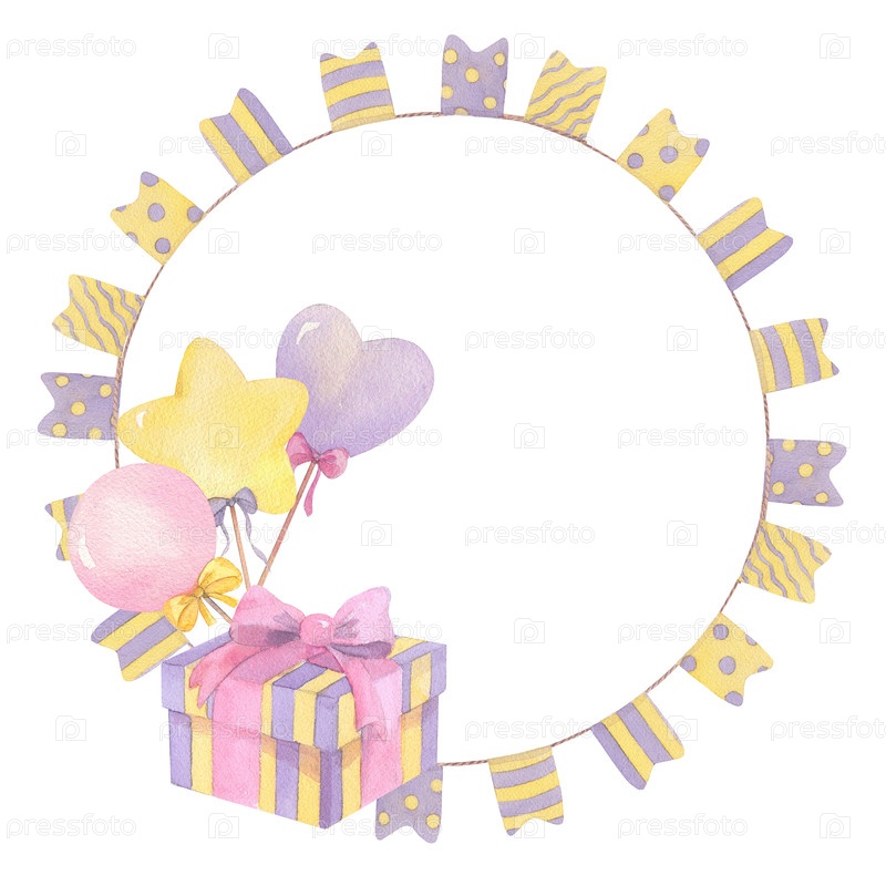 Венок из гирлянды с флагами и подарочная коробка с воздушными шарами. Иллюстрация ручной акварели. Для упаковочной бумаги, поздравительных открыток, украшений и иллюстраций