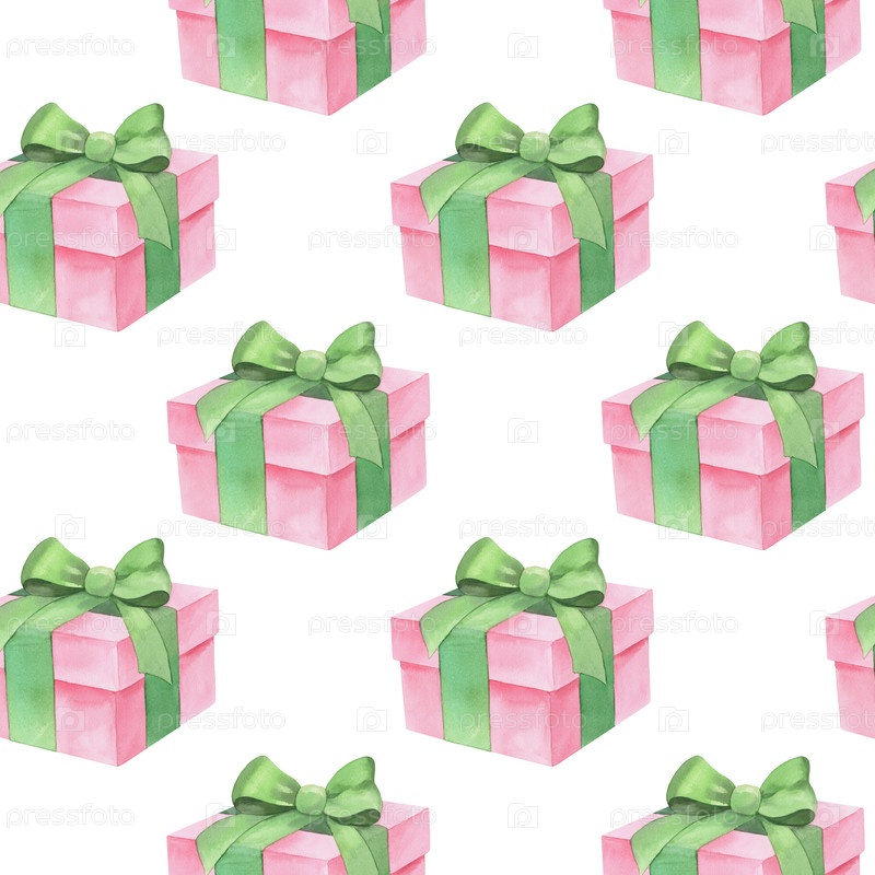 Бесшовный рисунок розовых подарочных коробок. Иллюстрация акварелью. Для ткани, обоев, упаковочной бумаги, поздравительных открыток, дизайна, декора и иллюстрации