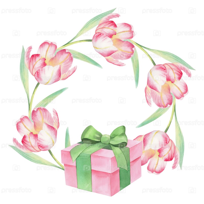 венок тюльпанов и подарочная коробка. акварельная иллюстрация. для ткани, обоев, упаковочной бумаги, поздравительных открыток, дизайна, декора и иллюстрации