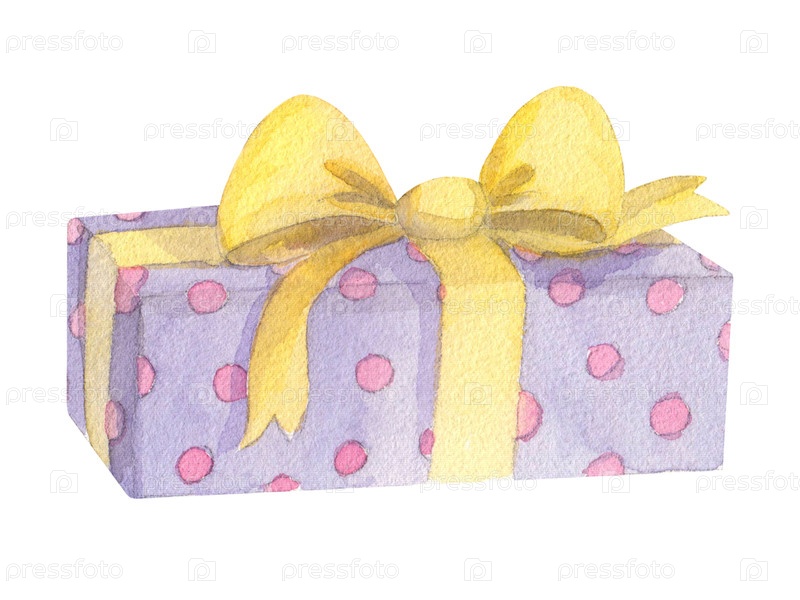 Фиолетовая подарочная коробка с желтой ленточкой. Ручное иллюстрация подаркового ящика. Для ткани, упаковочной бумаги, поздравительных открыток, дизайна, декора и иллюстрации