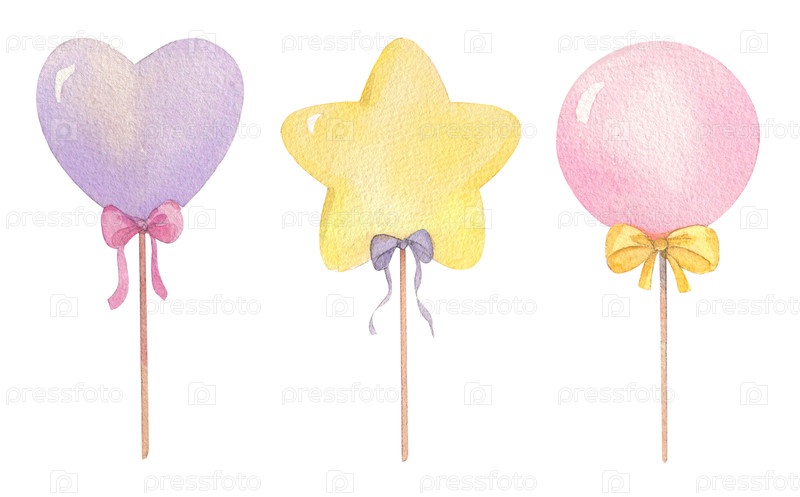Набор красочных круглых, звездных и сердечных конфет. Ручная акварельная иллюстрация леденец. Для ткани, упаковочной бумаги, поздравительных открыток, дизайна, декора и иллюстрации