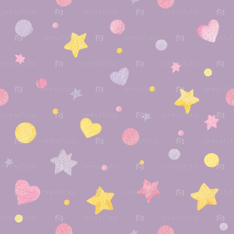 Бесшовный рисунок из красочных круглых, звездных и сердечных конфетти на фиолетовом фоне. Иллюстрация ручной акварели. Для упаковочной бумаги, поздравительных открыток, украшений и иллюстраций