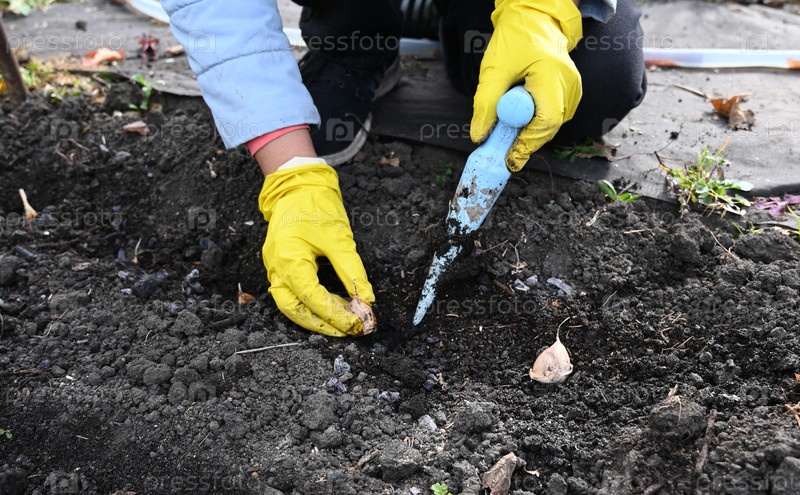 Садовник сажает зубчики чеснока в почву в солнечный весенний день