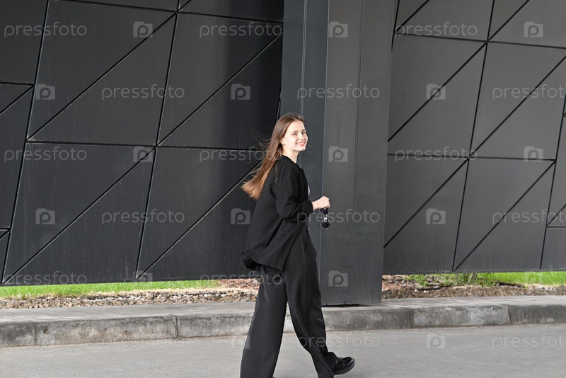 Женщина в стильном наряде держит солнцезащитные очки возле современной геометрической стены