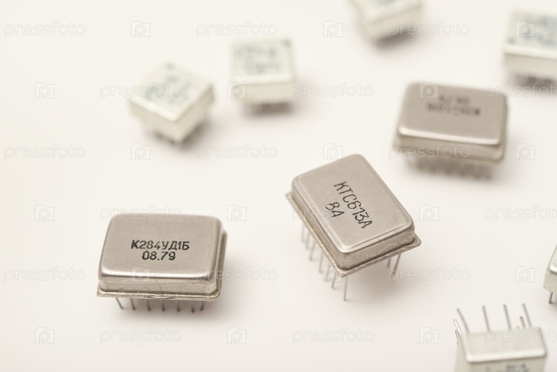 Старые чипы на белом фоне различные электронные чипы микрочипы в металлическом корпусе