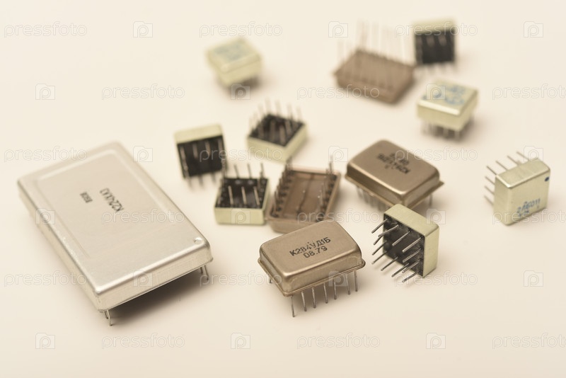 Старые чипы на белом фоне различные электронные чипы микрочипы в металлическом корпусе