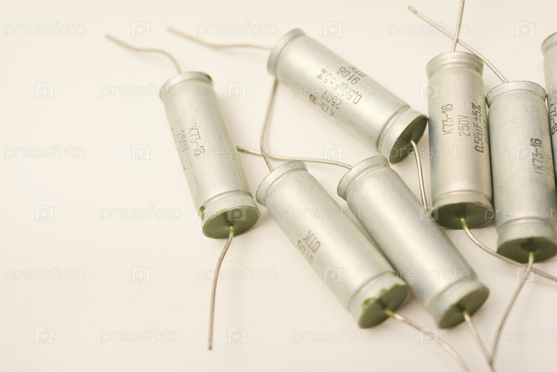 Старые конденсаторы в бумажной упаковке. Алюминиевые конденсаторы на белом фоне. Электронные компоненты