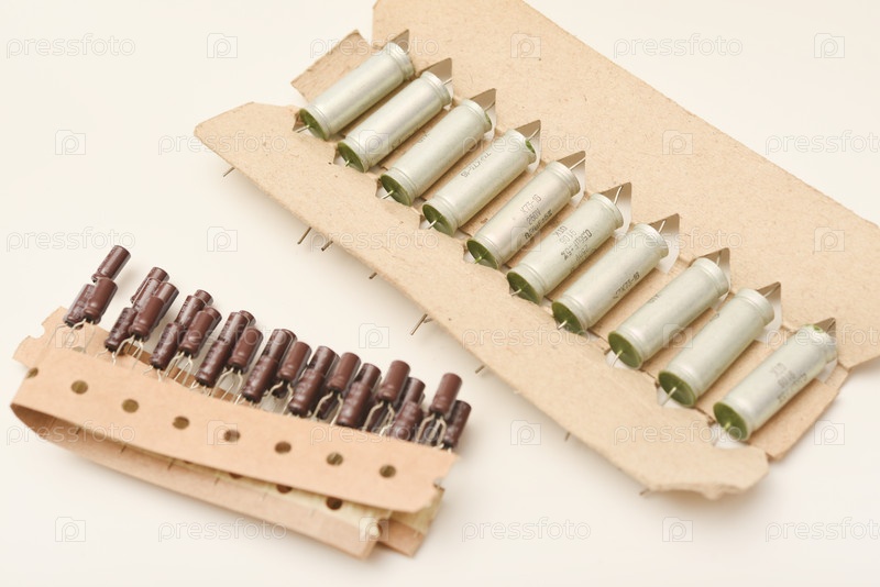 Старые конденсаторы в бумажной ленте. алюминиевые на белом фоне. электронные компоненты в оригинальной упаковке