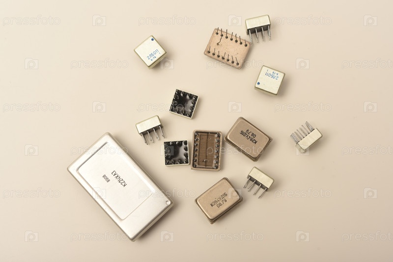 Старые чипы на белом фоне различные электронные чипы микрочипы в металлическом корпусе