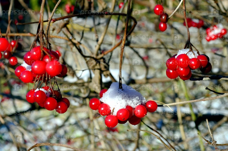 Первый снег в саду. ягоды Калины под снегом. первый снег, первые морозы, заморозки