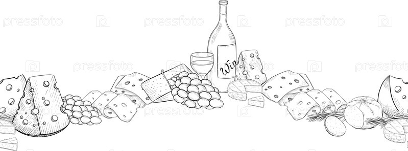 Коллекция сыров, бри, кемберта, пармезана и голубого сыра, европейского сырного ассортимента, ломты, черный рисунок с гравюрой чернилами, изолированные, прозрачные. бутылка вина и стекла, виноград и инжир