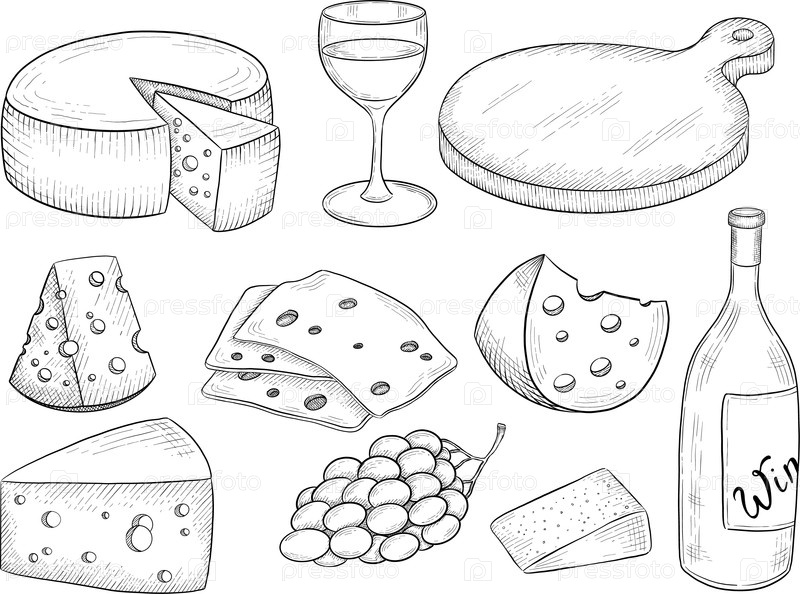 Коллекция сыров, бри, кемберта, пармезана и голубого сыра, европейского сырного ассортимента, ломты, черный рисунок с гравюрой чернилами, изолированные, прозрачные. бутылка вина и стекла, виноград и инжир