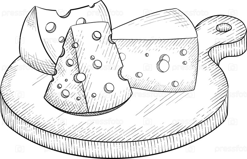 Коллекция сыров, бри, кемберта, пармезана и голубого сыра, европейского сырного ассортимента, ломты, черный рисунок с гравюрой чернилами, изолированные, прозрачные. бутылка вина и стекла, виноград и инжир