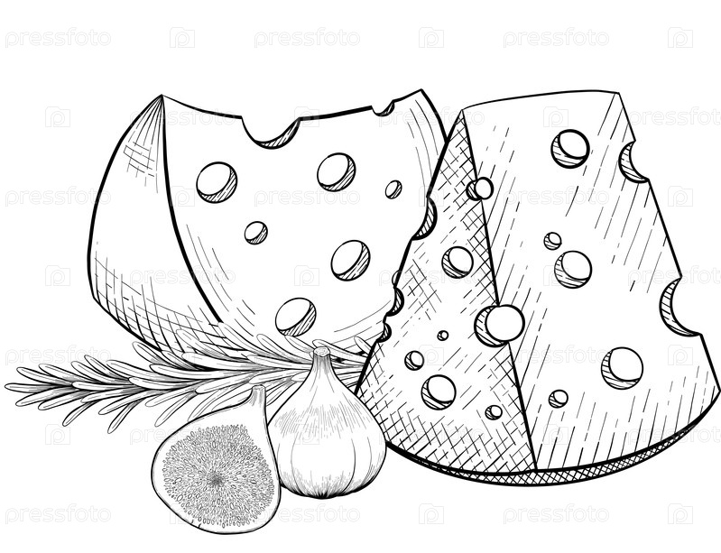 Коллекция сыров, бри, кемберта, пармезана и голубого сыра, европейского сырного ассортимента, ломты, черный рисунок с гравюрой чернилами, изолированные, прозрачные. бутылка вина и стекла, виноград и инжир