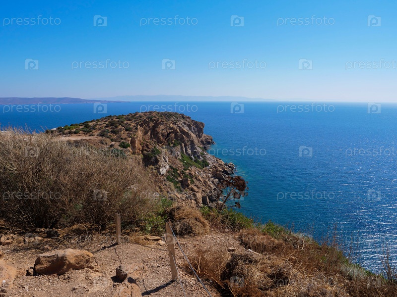 Пляж с холмами, покрытыми кустарниками и травой, рядом с чистым голубым морем