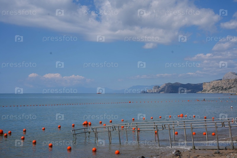 Изображение показывает побережье с волнами, горы на расстоянии и ясное светло-синее небо