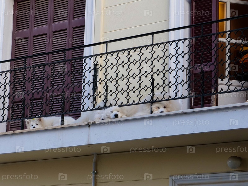 Балкон с черными металлическими перилами, за ним видны две белые собаки