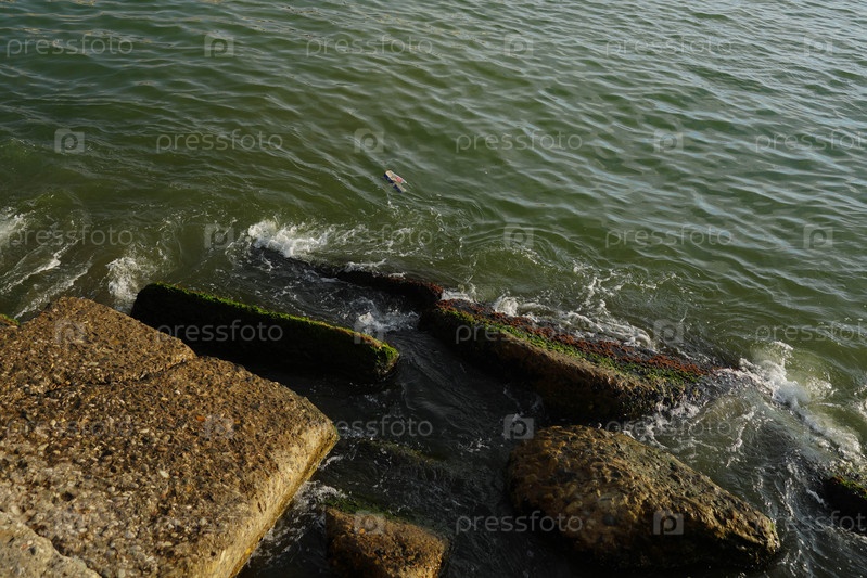 Изображение показывает побережье с волнами, горы на расстоянии и ясное светло-синее небо