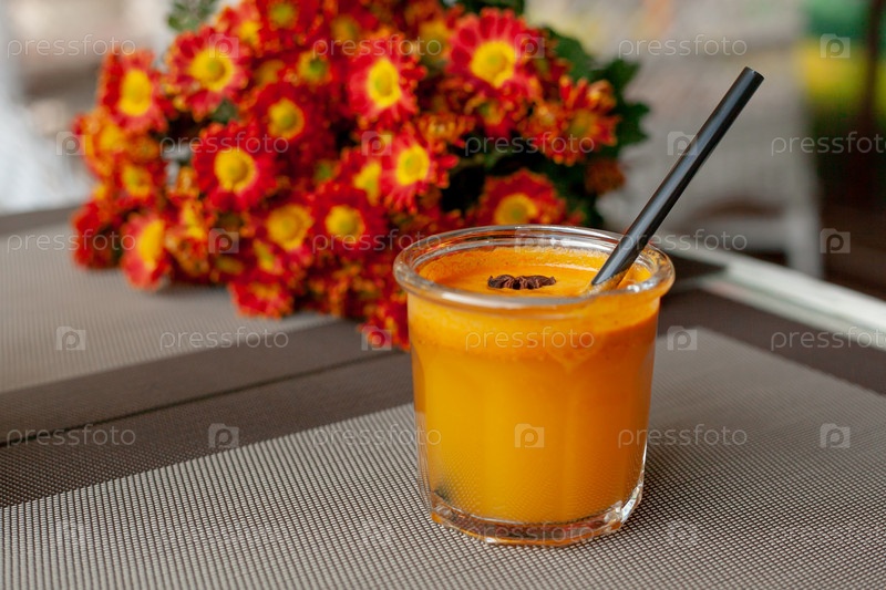 Осенний напиток в стакане с трубой и куском звездного аниса среди букета ярко-оранжевых астеров на открытой террасе