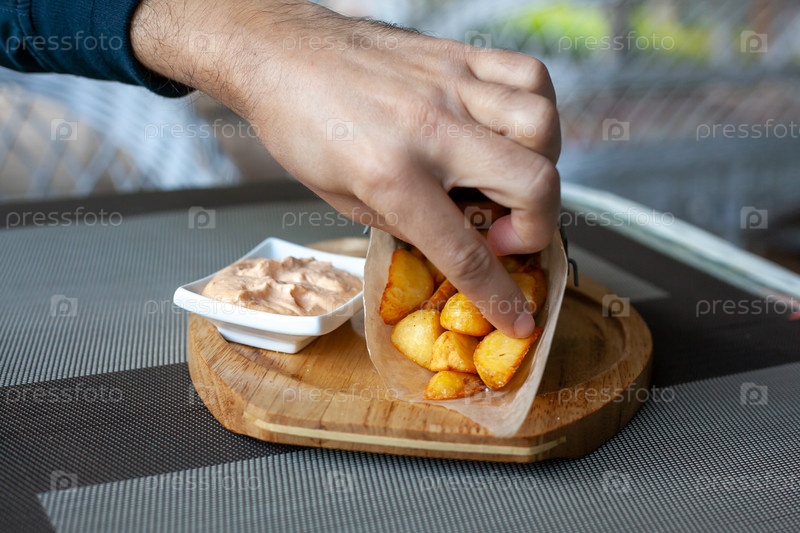 Жареный картофель клин в бумажном конверте с соусом на деревянной тарелке на открытой террасе в кафе
