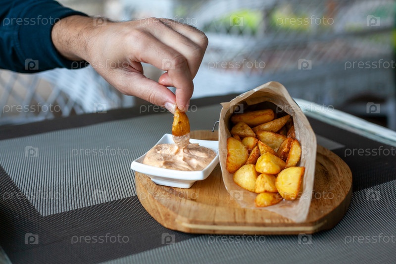 Жареный картофель клин в бумажном конверте с соусом на деревянной тарелке на открытой террасе в кафе