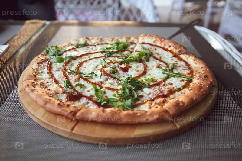 Пицца с ругулой на деревянной тарелке на сером фоне на летней террасе