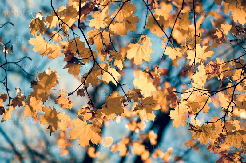Естественные осенние кленовые листья на ветке, через которую заходящее солнце светит над голубым небом, фон с копировальным пространством
