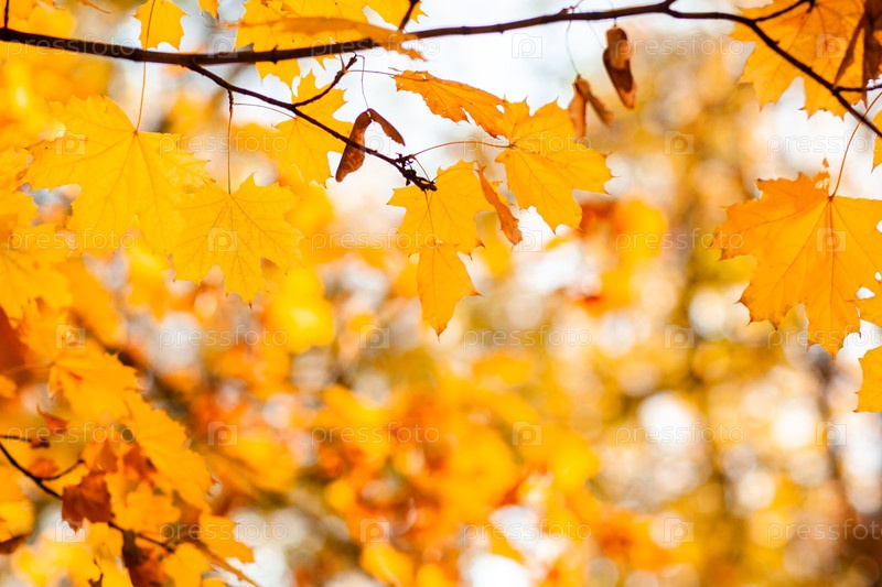 Естественный осенний клён идет на ветку, через которую светит заходящее солнце