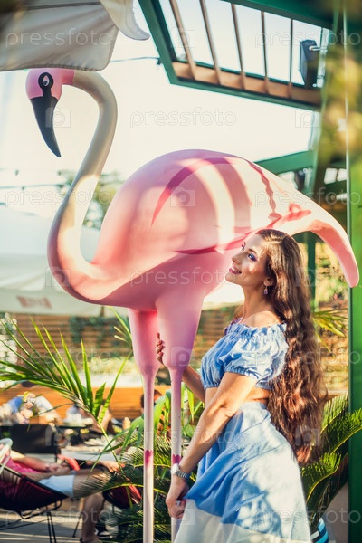 Красивая молодая женщина с длинными темными волосами в коротком верхнем виде стоит рядом с большой фигурой фламинго и играет, позирует, смеется