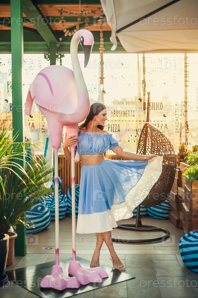 Красивая молодая женщина с длинными темными волосами в коротком верхнем виде стоит рядом с большой фигурой фламинго и играет, позирует, смеется