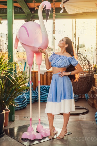 Красивая молодая женщина с длинными темными волосами в коротком верхнем виде стоит рядом с большой фигурой фламинго и играет, позирует, смеется