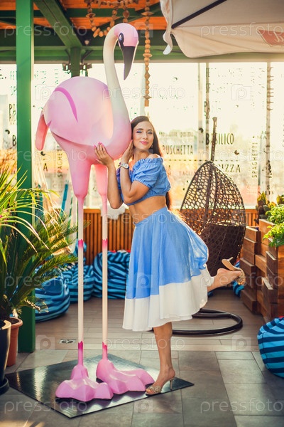 Красивая молодая женщина с длинными темными волосами в коротком верхнем виде стоит рядом с большой фигурой фламинго и играет, позирует, смеется
