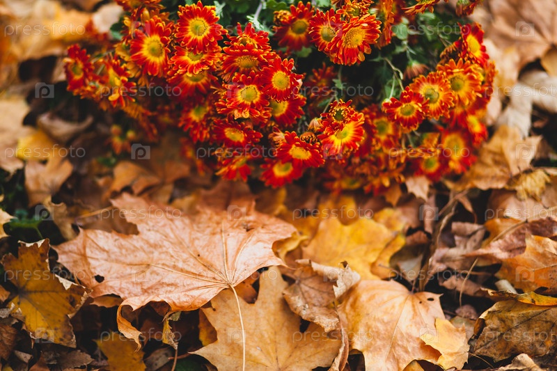 Оранжевые цветы хризантемы на фоне выпавших листьев с копировальным пространством и селективным фокусом