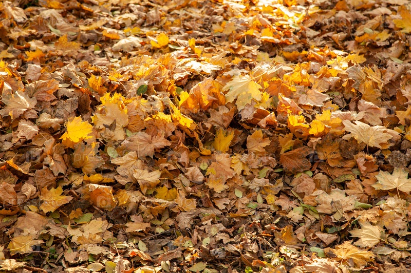 Многие желтые и оранжевые сухие листья лежат на земле