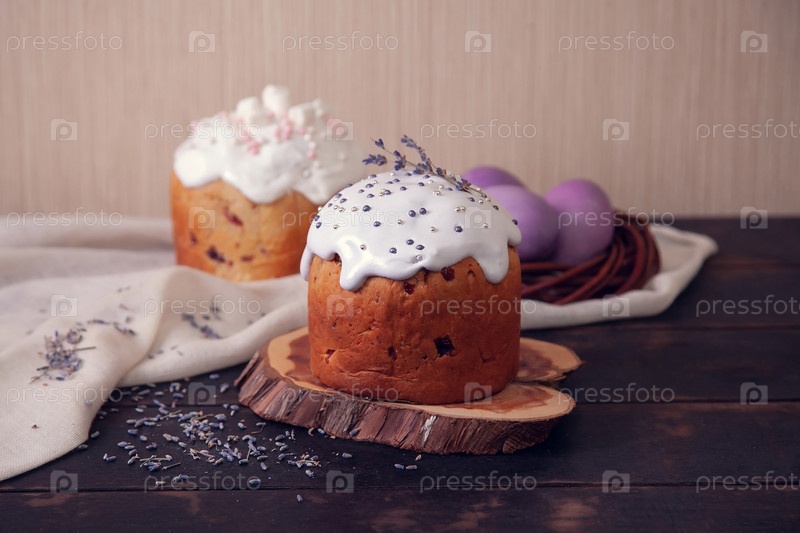 Пасхальные торты, украшенные лавандой и зефиром, а также окрашенные пасхальные яйца в плетеновом гнезде