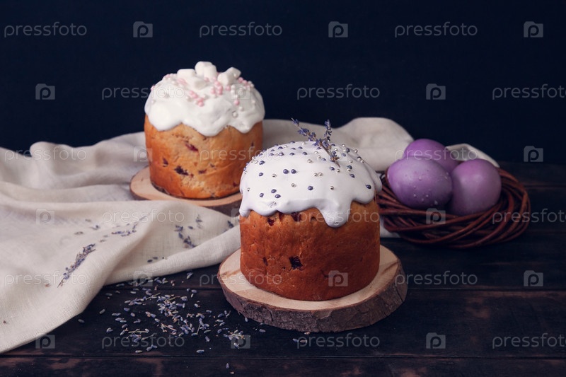 Пасхальные торты на темном фоне, украшенные лавандой и зефирами, а также окрашенные пасхальные яйца в плетеновое гнездо