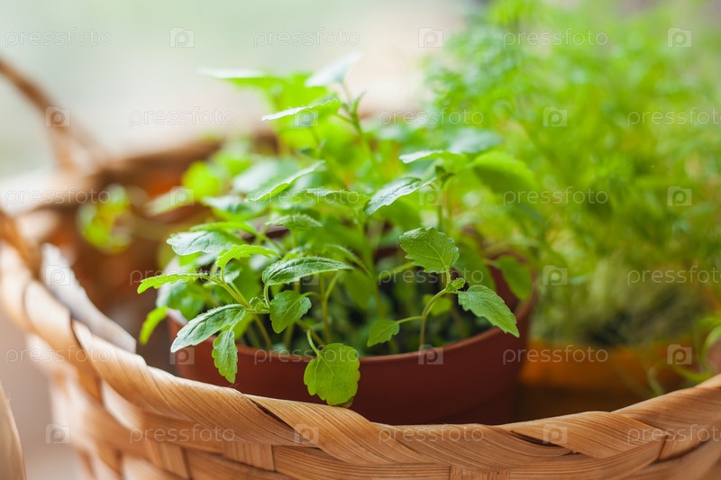 Молодые побеги мелисса и уксус в горшке и корзине на белом подоконнике