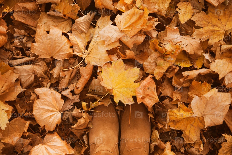 Осенние желтые и оранжевые сухие листья лежат на земле с женскими каблуками