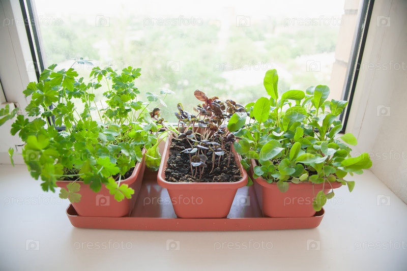 Молодые побеги петрушки, руколы и фиолетового базилика в горшке на белом подоконнике