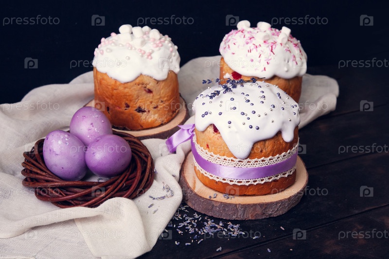 Пасхальные торты на темном фоне, украшенные лавандой и зефирами, а также окрашенные пасхальные яйца в плетеновое гнездо